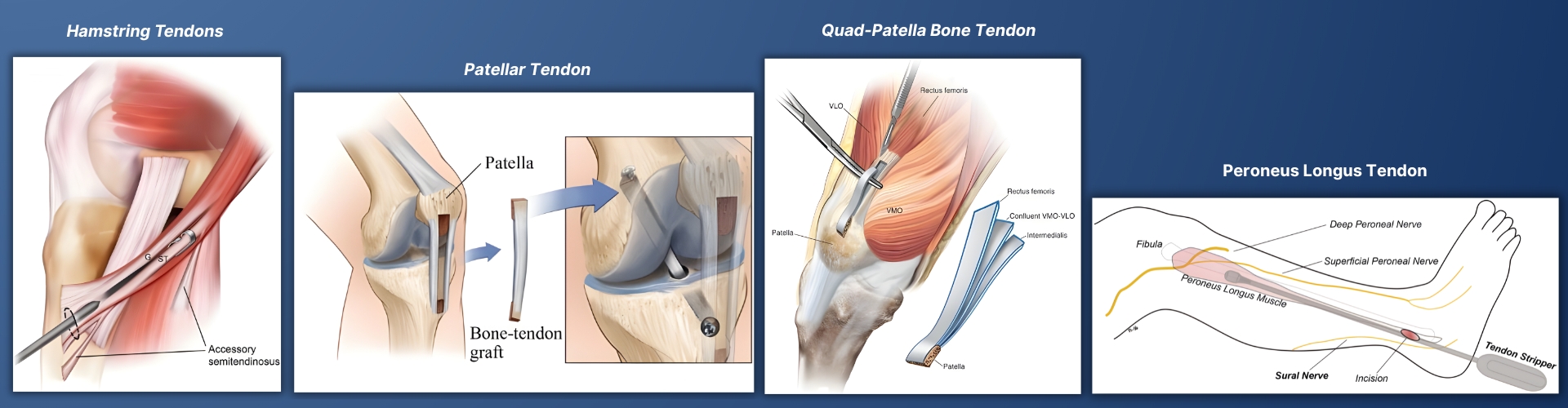 autografts are the Bone-Patellar tendon-bone (BPTB), Hamstring tendon, Quadriceps tendon, and the Peroneus