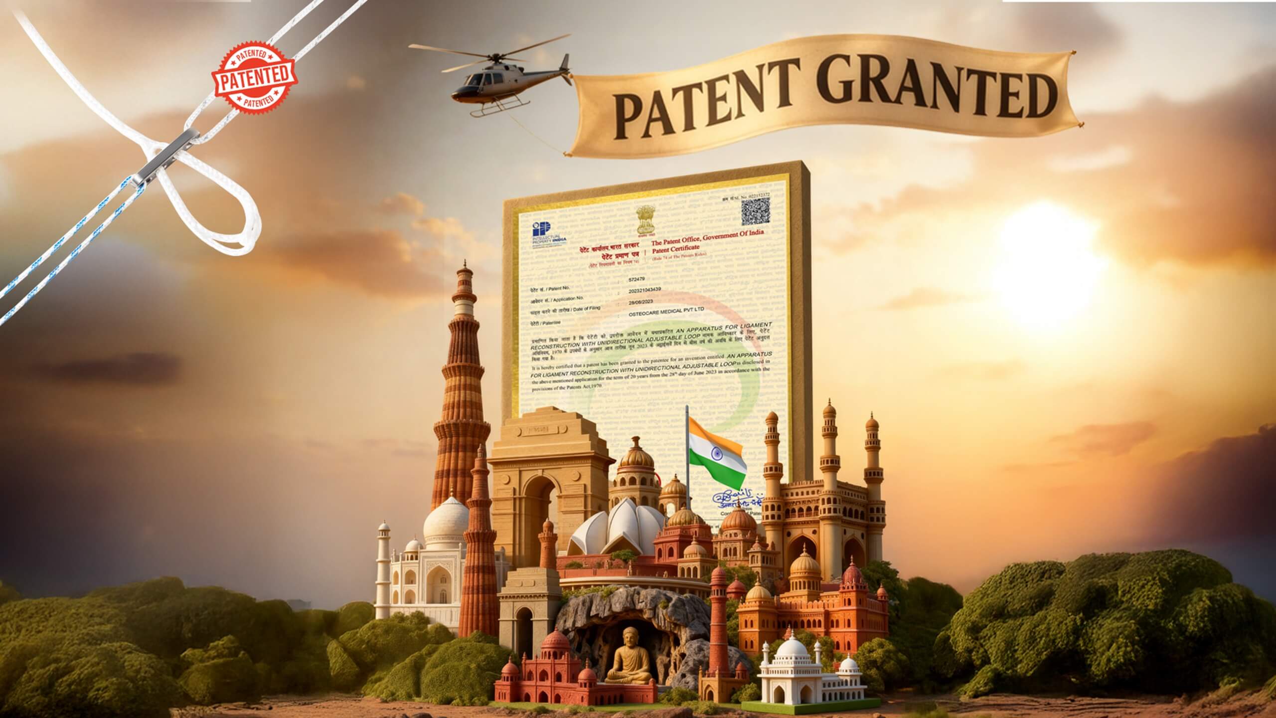 Finally, on 23rd October 2025, Osteocare Medical Pvt. Ltd. was officially granted Patent No. 572479 by the Government of India for the invention titled “An Apparatus for Ligament Reconstruction with Unidirectional Adjustable Loop.”