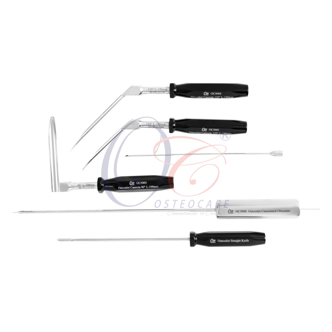 The OC Osteoslot Hip Arthroscopy Instruments are designed for use in arthroscopic procedures in the hip joint. These reusable instruments include slotted cannulas, cannulated obturator, guide wire, spinal needle, and straight knife. They provide the surgeon with safe portal placement and support both diagnostic and therapeutic hip arthroscopy.