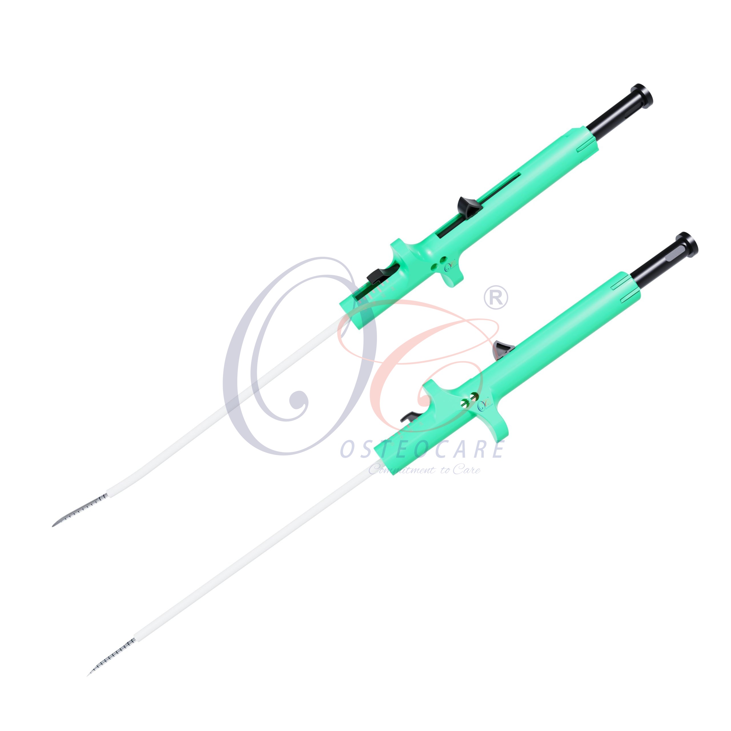 The OC OsteoStitch™ System is designed for efficient and precise meniscal repair. Its ergonomic thumb trigger and plunger ensure smooth, single-handed use, with a deployment method that includes pull-to-load and push-to-deploy options. The system features an adjustable depth lever (12–24 mm) for customizable penetration and a deployment indicator window for accurate anchor placement. With its 17-gauge needle, all-PEEK anchors (1mm x 5mm), and 2-0 White/Black UHMWPE suture.