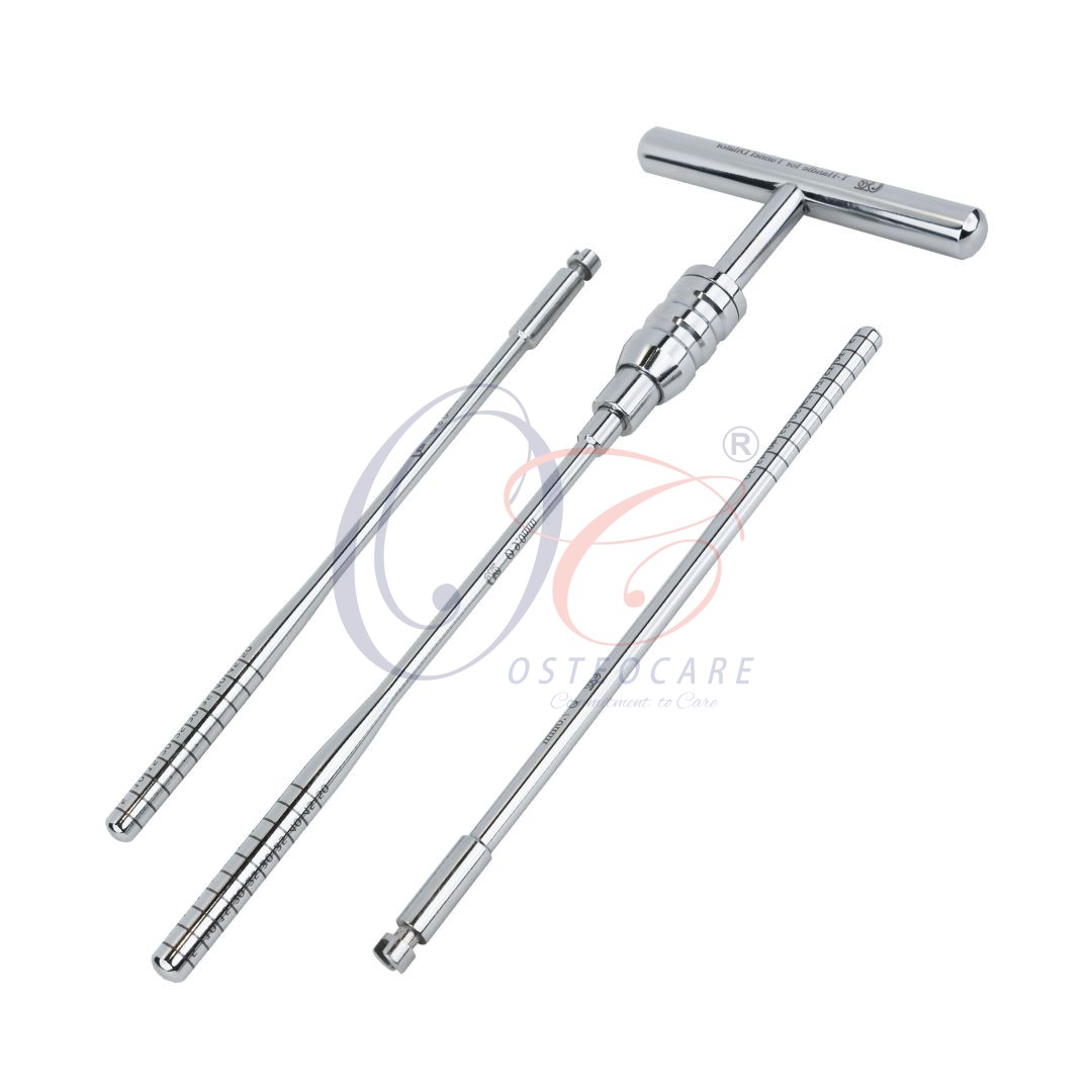 Tunnel dilators are used to safely expand the size of tibial or femoral tunnels during cruciate reconstruction surgery. They offer a minimally invasive approach to tunnel enlargement, compressing cancellous bone during the process. Their tapered ends allow for easy insertion and removal from the tunnel, while full radiused depth marks in 5mm increments provide accurate guidance for controlling the size of the tunnel. Ergonomic design of T-handle provides comfort and control during use. The dilators are available in cannulated and non-cannulated versions with different diameter ranging from 7mm to 10mm.